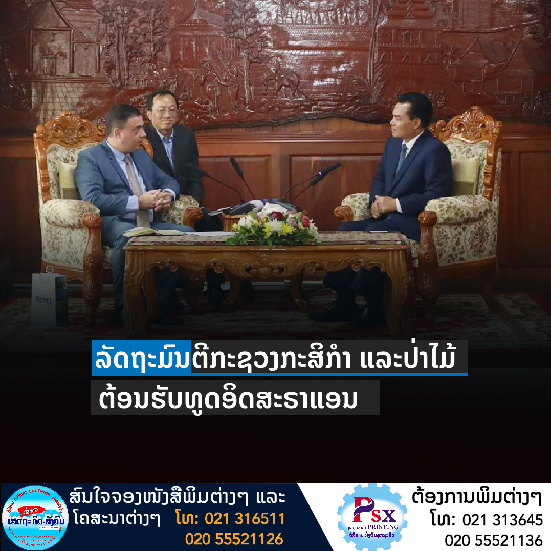 ໃນວັນທີ 5 ກໍລະກົດ 2022 ຜ່ານມາ, ທ່ານ ເພັດ ພົມພິພັກ ລັດຖະມົນຕີກະຊວງກະສິກໍາ ແລະປ່າໄມ້ ໄດ້ຕ້ອນຮັບການເຂົ້າຢ້ຽມຂ່ານັບຂອງ ທ່ານ ນາດາບ ເອັສກາ (Nadav Eshcar) ເອກອັກຄະລັດຖະທູດ ແຫ່ງ ອິດສະຣາແອນ ປະຈໍາ ສປປ ລາວ