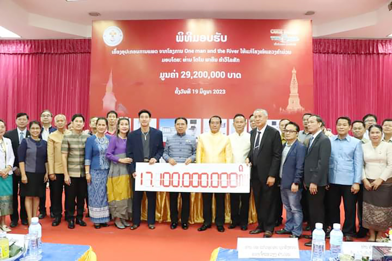 ພິທີມອບ-ຮັບ ອຸປະກອນການແພດຈາກໂຄງການ 1 ຄົນລອຍ ຫລາຍຄົນໃຫ້ (One man and the River) ຈັດຂຶ້ນ ໃນວັນທີ 19 ມິຖຸນາ 2023 ທີ່ແຂວງຄໍາມ່ວນໂດຍການເຂົ້າຮ່ວມຂອງ ທ່ານ ວັນໄຊ ພອງສະຫວັນ ເຈົ້າແຂວງຄຳມ່ວນ,