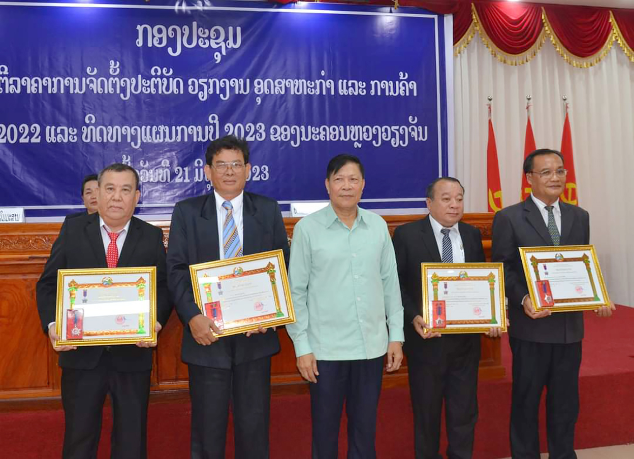 ກອງປະຊຸມສະຫຼຸບການ ເຄື່ອນໄຫວອຸດສາຫະກຳ ແລະການຄ້າ ປະຈຳປີ 2022 ທິດທາງແຜນການປີ 2023 ແລະຍ້ອງຍໍຜົນງານຜົນນນງານ 5 ປີ (2016-2020)ຂອງພະແນກອຸດສາຫະກຳ ແລະການຄ້າ ນະຄອນຫລວງວຽງຈັນ (ນວ) ໄດ້ຈັດຂຶ້ນໃນວັນທີ 22 ມິຖຸນາ 2023 ທີ່ພະແນກດັ່ງກ່າວ.