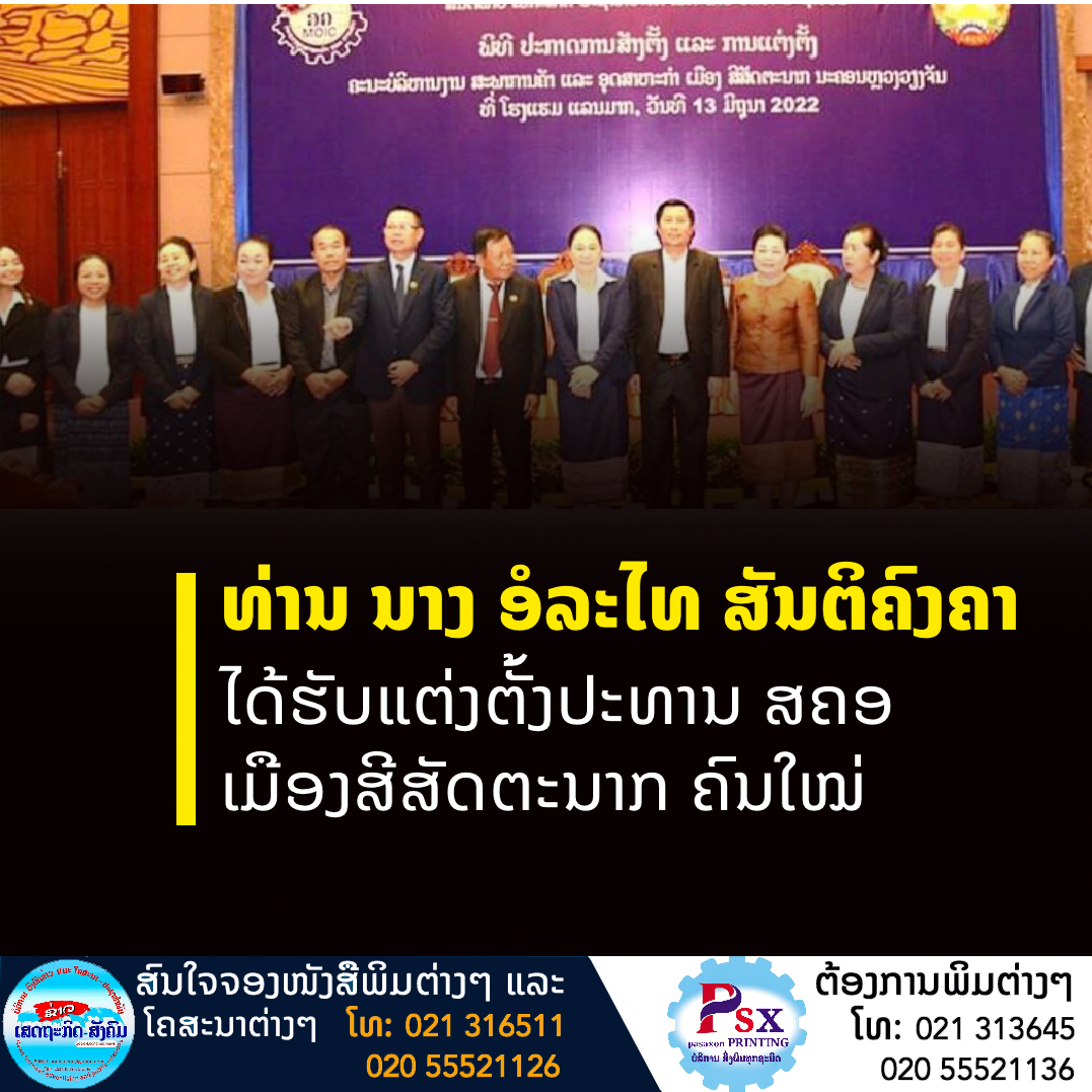 ວັນທີ 13 ມິຖຸນາ 2022 ທີ່ໂຮງແຮມແລນມາກ ນະຄອນຫຼວງວຽງຈັນ ໄດ້ມີພິທີສ້າງຕັ້ງຄະນະບໍລິຫານງານສະພາການຄ້າ ແລະອຸດສາຫະກໍາ (ສຄອ) ເມືອງສີສັດຕະນາກ ນະຄອນຫຼວງວຽງຈັນ ເປັນປະທານຂອງທ່ານ ນາງ ວັນມະນີ ພິມມະສານ ຫົວໜ້າພະແນກອຸດສາຫະກຳ ແລະກາຄ້າ ນວ