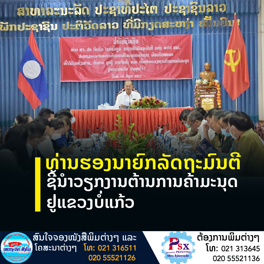 ໃນວັນທີ 14 ມິຖຸນາ 2022 ທ່ານ ກິແກ້ວ ໄຂຄໍາພິທູນ, ຮອງນາຍົກລັດຖະມົນຕີ, ປະທານຄະນະກຳມະການຕ້ານການຄ້າມະນຸດລະດັບຊາດພ້ອມດ້ວຍຄະນະໄດ້ເຄື່ອນໄຫວເຮັດວຽກ ແລະ ພົບປະໂອ້ລົມ ການນຳຫຼັກແຫຼ່ງ ແຂວງບໍ່ແກ້ວ