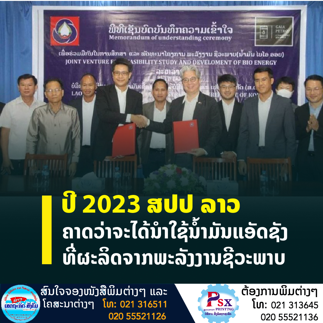 ບໍລິສັດ ລັດວິສາຫະກິດ ນໍ້າມັນເຊື້ອໄຟລາວ ແລະບໍລິສັດ ກ່າຍອາ ເປໂຕຣ ຈຳກັດ (ສ ເກົາຫລີ) ເຊັນບົດບັນທຶກຄວາມເຂົ້າໃຈເພື່ອຮ່ວມມືກັນໃນການສຶກສາ ແລະ ພັດທະນາໂຄງການພະລັງງານຊີວະພາບ (ນໍ້າມັນໄບໂອ ອອຍ) ໂດຍຈະນຳໃຊ້ພະລັງງານມາຈາກທຳມະຊາດ 2 ແຫລ່ງຄື:
