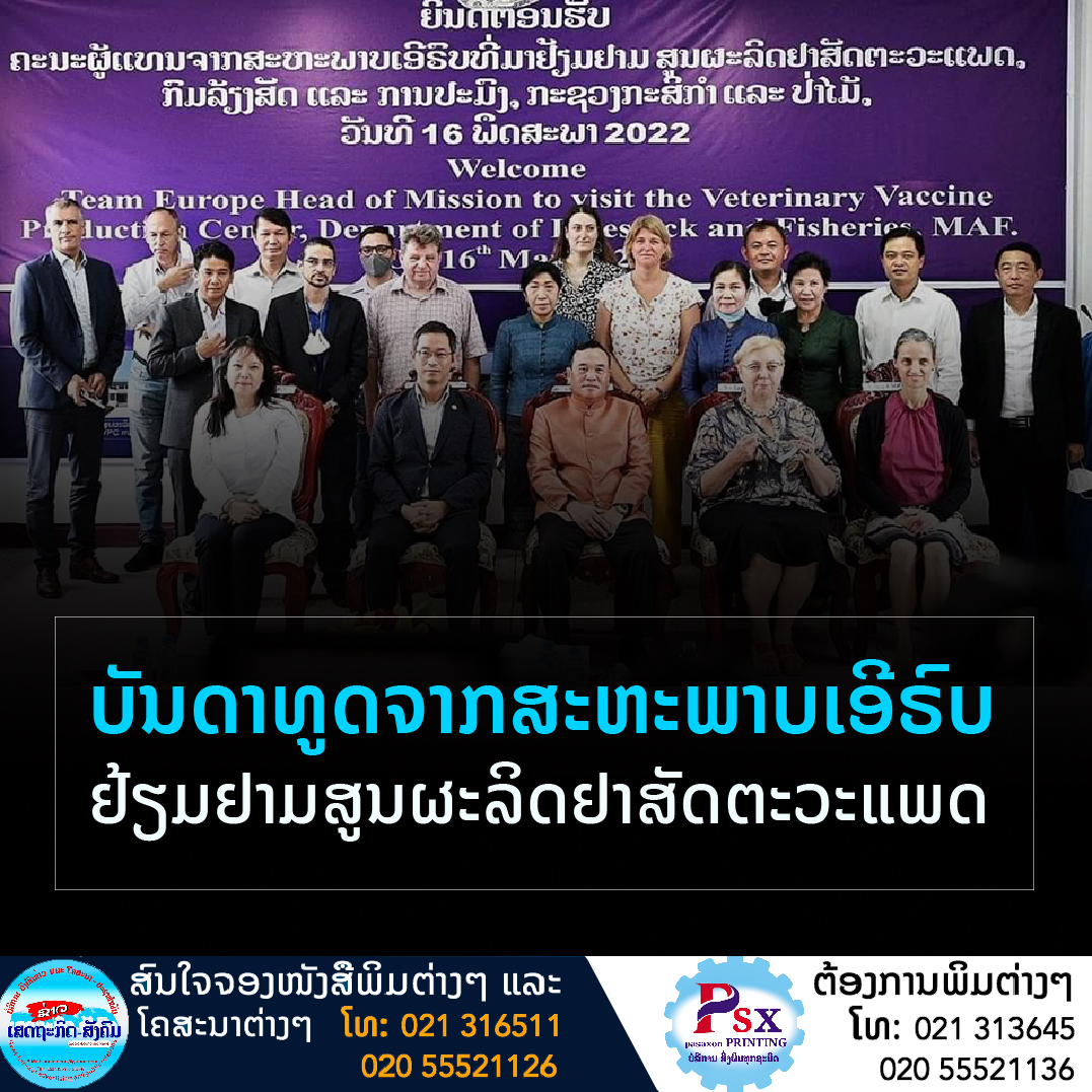 ໃນວັນທີ 16 ພຶດສະພາ ທີ່ຜ່ານມາ, ບັນດາທູດຈາກ ສະຫະພາບເອີຣົບ (EU) ນໍາໂດຍ ທ່ານ ນາງ ອີນາ ມາຈູລີໂອນີແຕ (Ina Marciulionyte ) ເອກອັກຄະລັດຖະທູດ ສະຫະພາບເອີຣົບ ປະຈຳ ສປປ ລາວ ໄປຢ້ຽມຢາມໂຄງການຕ່າງໆຂອງທີມ EU ຢູ່ ນະຄອນຫລວງວຽງຈັນ,