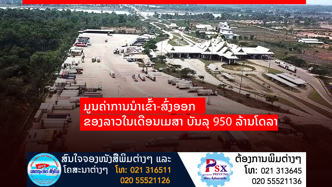 ອີງຕາມສູນຂໍ້ມູນຂ່າວສານທາງດ້ານການຄ້າຂອງ ສປປ ລາວ ໃຫ້ຮູ້ວ່າ: ມູນຄ່າການນໍາເຂົ້າ ແລະສົ່ງອອກ ຂອງ ສປປ ລາວ ປະຈໍາເດືອນເມສາ 2022 ບັນລຸໄດ້ປະມານ 950 ລ້ານໂດລາສະຫະລັດ (ບໍ່ກວມເອົາມູນຄ່າການສົ່ງອອກໄຟຟ້າ)