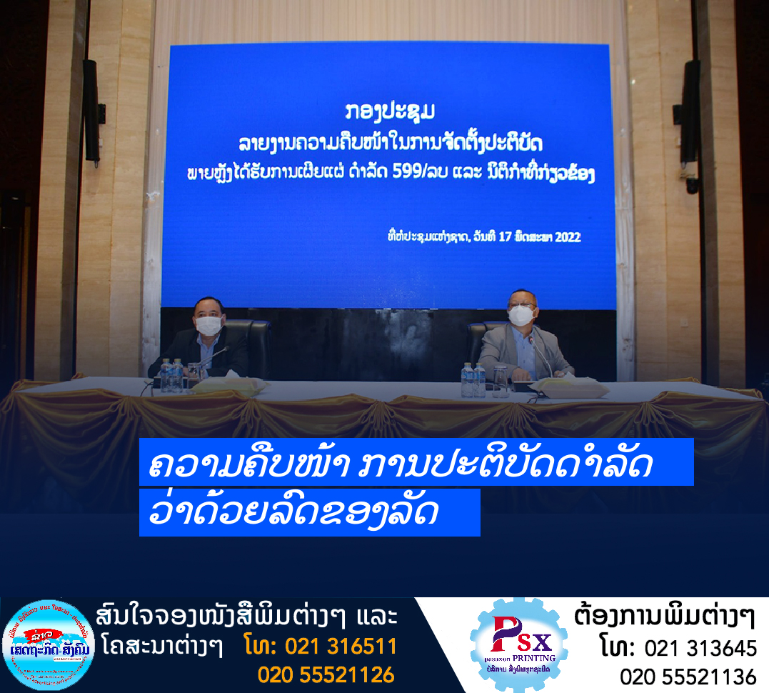 ໃນວັນທີ 17 ພຶດສະພາ 2022 ທີ່ຫໍປະຊຸມແຫ່ງຊາດ, ຫ້ອງວ່າການສຳນັກງານນາຍົກລັດຖະມົນຕີ ຮ່ວມກັບ ກະຊວງການເງິນ ໄດ້ຈັດກອງປະຊຸມລາຍງານຄວາມຄືບໜ້າໃນການຈັດຕັ້ງປະຕິບັດ ດຳລັດສະບັບເລກທີ 599/ລບ ແລະນິຕິກຳທີ່ກ່ຽວຂ້ອງ