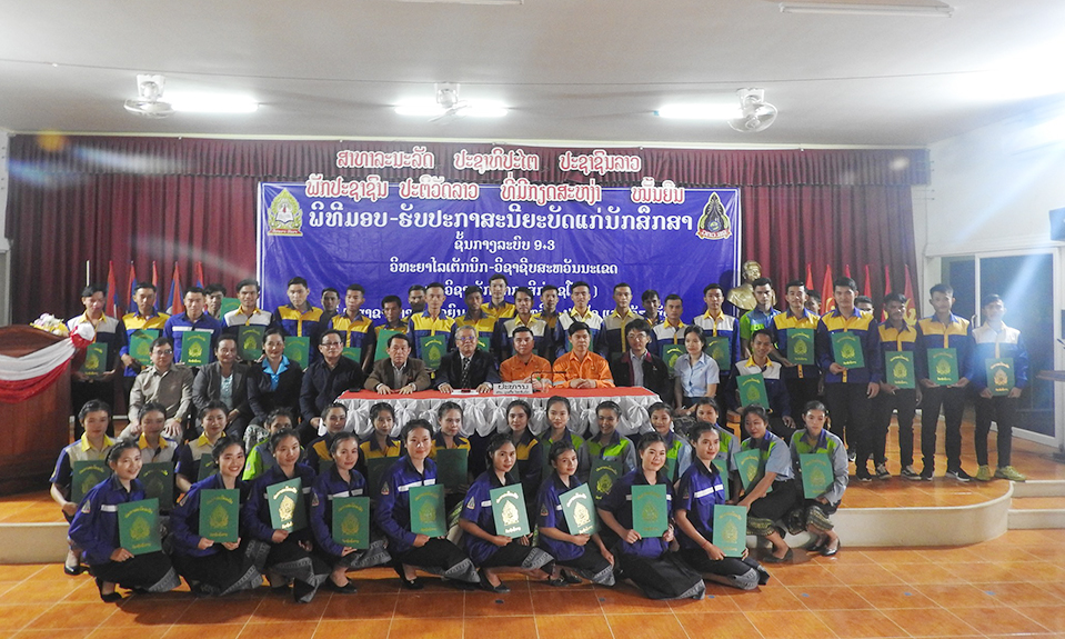 ວັນທີ 3 ທັນວາ ຜ່ານມາຢູ່ສະໂມສອນຫ້ອງວ່າການເມືອງເຊໂປນ ແຂວງສະຫວັນນະເຂດ ໄດ້ຈັດພິທີມອບ-ຮັບໃບປະກາສະນີຍະບັດໃຫ້ແກ່ນັກຮຽນນັກສຶກສາຜູ້ສໍາເລັດການສຶກສາຊັ້ນກາງ (ລະບົບ 9+3) ມີ 5 ສາຂາຄື: ລົດຍົນ, ໄຟ ຟ້າ, ຕັດຫຍິບ, ປູກຝັງ ແລະລ້ຽງສັດ