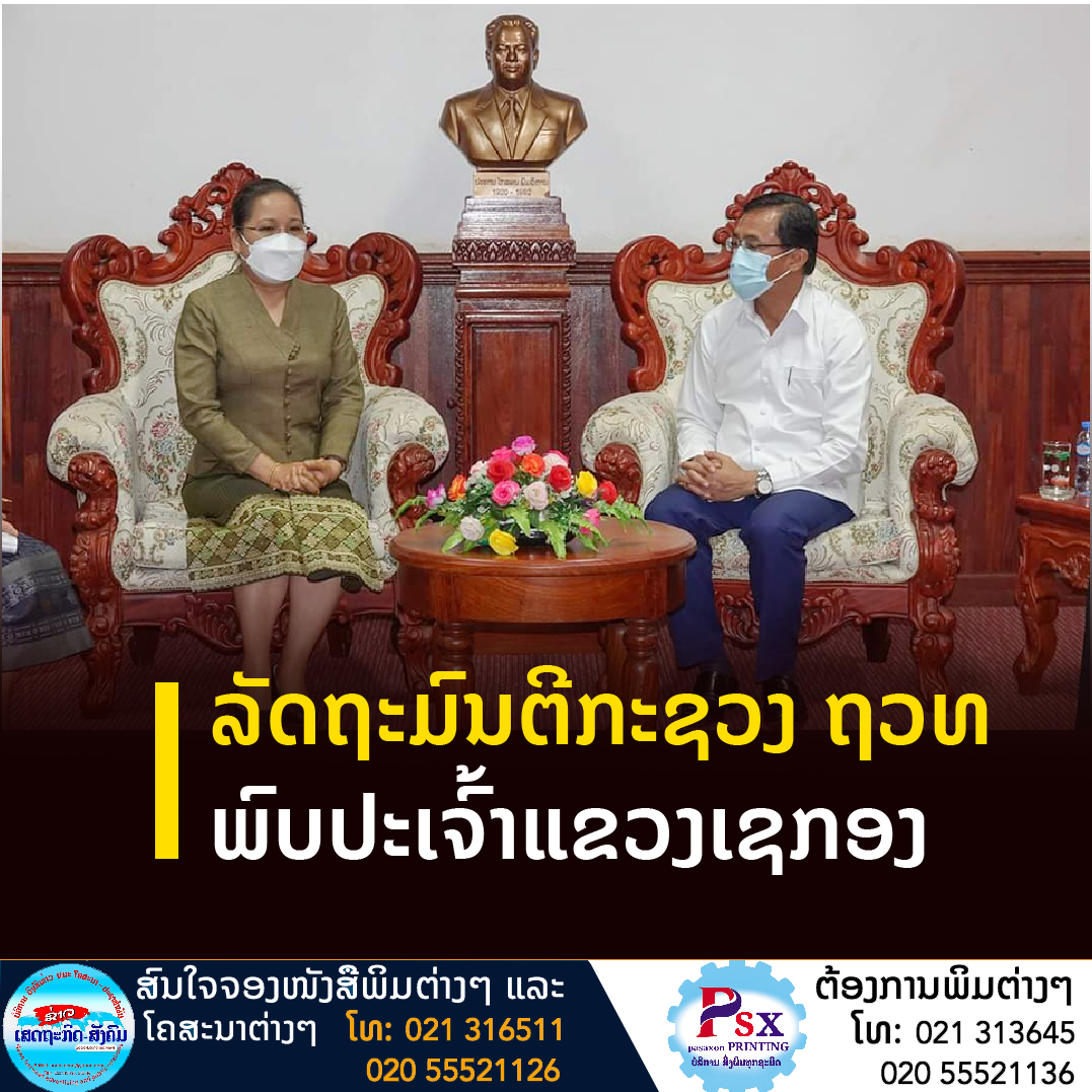 ໃນໂອກາດເຄື່ອນໄຫວຊຸກຍູ້ວຽກງານ ຖວທ ຢູ່ແຂວງເຊກອງ ໃນວັນທີ 6 ເມສາ 2022 ທ່ານ ນາງ ສວນສະຫວັນ ວິຍະເກດ ລັດຖະມົນຕີ ກະຊວງຖະແຫຼງຂ່າວ ວັດທະນະທຳ ແລະທ່ອງທ່ຽວ,ໄດ້ຖືໂອກາດພົບປະກັບທ່ານ ເຫຼັກໄຫຼ ສີວິໄລ ເຈົ້າແຂວງເຊກອງ.