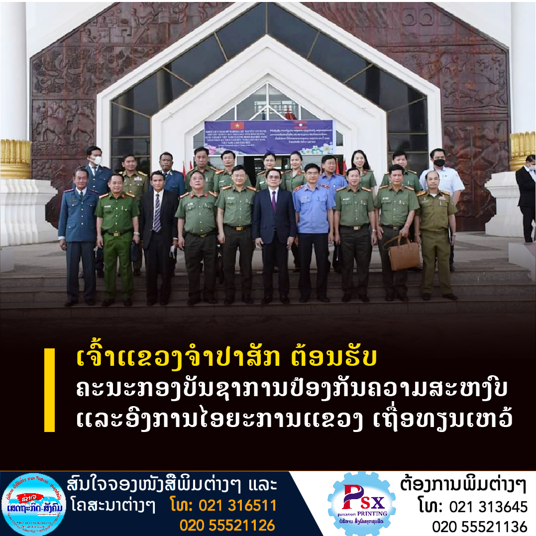 ມື່ອວັນທີ 7 ເມສາ 2022 ທີ່ຫ້ອງວ່າການແຂວງຈຳປາສັກ, ທ່ານ ວິໄລວົງ ບຸດດາຄຳ ເຈົ້າແຂວງຈຳປາສັກ ໄດ້ຕ້ອນຮັບການເຂົ້າຢ້ຽມຂໍ່ານັບຂອງຄະນະກອງບັນຊາການປ້ອງກັນຄວາມສະຫງົບແຂວງ ແລະຄະນະອົງການໄອຍະການ ແຂວງເຖື່ອທຽນເຫວ້ ແຫ່ງ ສສ ຫວຽດນາມ.