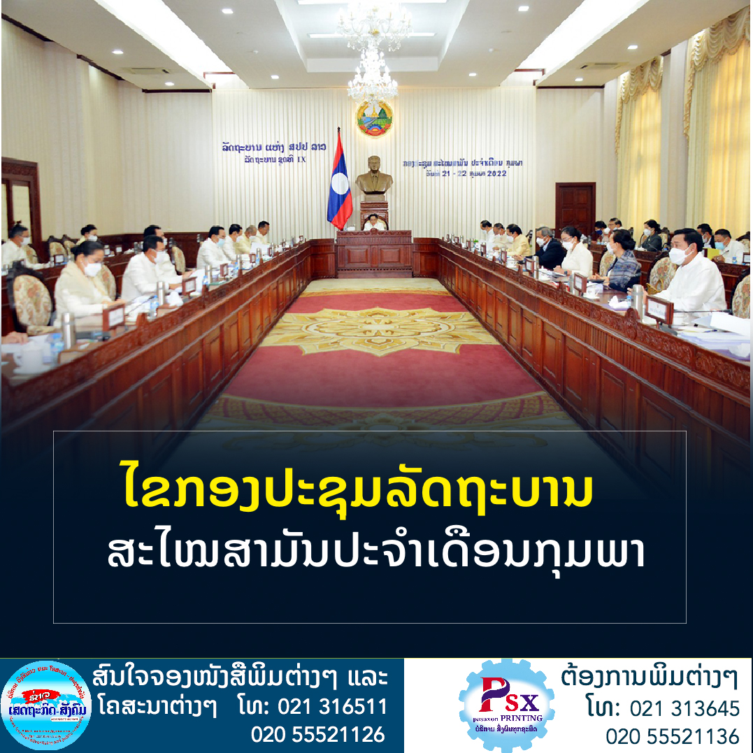 ກອງປະຊຸມລັດຖະບານ ສະໄໝສາມັນປະຈຳເດືອນກຸມພາ 2022 ໄດ້ໄຂຂຶ້ນຢ່າງເປັນທາງການໃນຕອນເຊົ້າມື້ນີ້ທີ່ສໍານັກງານນາຍົກລັດຖະມົນຕີ, ພາຍໃຕ້ການເປັນປະທານຂອງ ທ່ານ ພັນຄຳ ວິພາວັນ ນາຍົກລັດຖະມົນຕີ, ມີບັນດາຮອງນາຍົກລັດຖະມົນຕີ ແລະສະມາຊິກລັດຖະບານ ເຂົ້າຮ່ວມຢ່າງພ້ອມພຽງ,