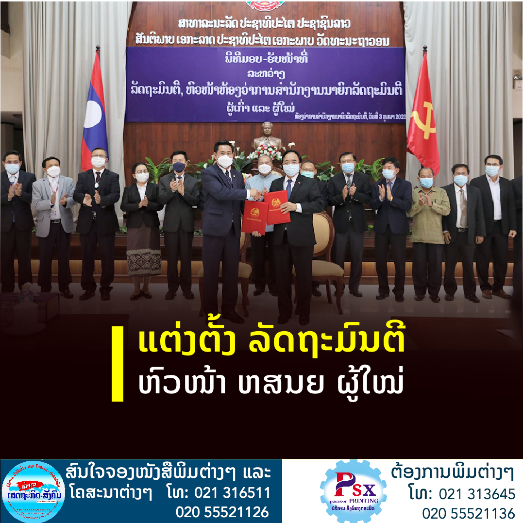 ພິທີມອບ-ຮັບໜ້າທີ່ລະຫວ່າງ ທ່ານ ຄຳເຈນ ວົງໂພສີ ລັດຖະມົນຕີ, ຫົວໜ້າຫ້ອງວ່າການສຳນັກງານນາຍົກລັດຖະມົນຕີ (ຜູ້ເກົ່າ) ແລະ ທ່ານ ອາລຸນໄຊ ສູນນະລາດ ລັດຖະມົນຕີ, ຫົວໜ້າຫ້ອງວ່າການສຳນັກງານນາຍົກລັດຖະມົນຕີ (ຜູ້ໃໝ່),