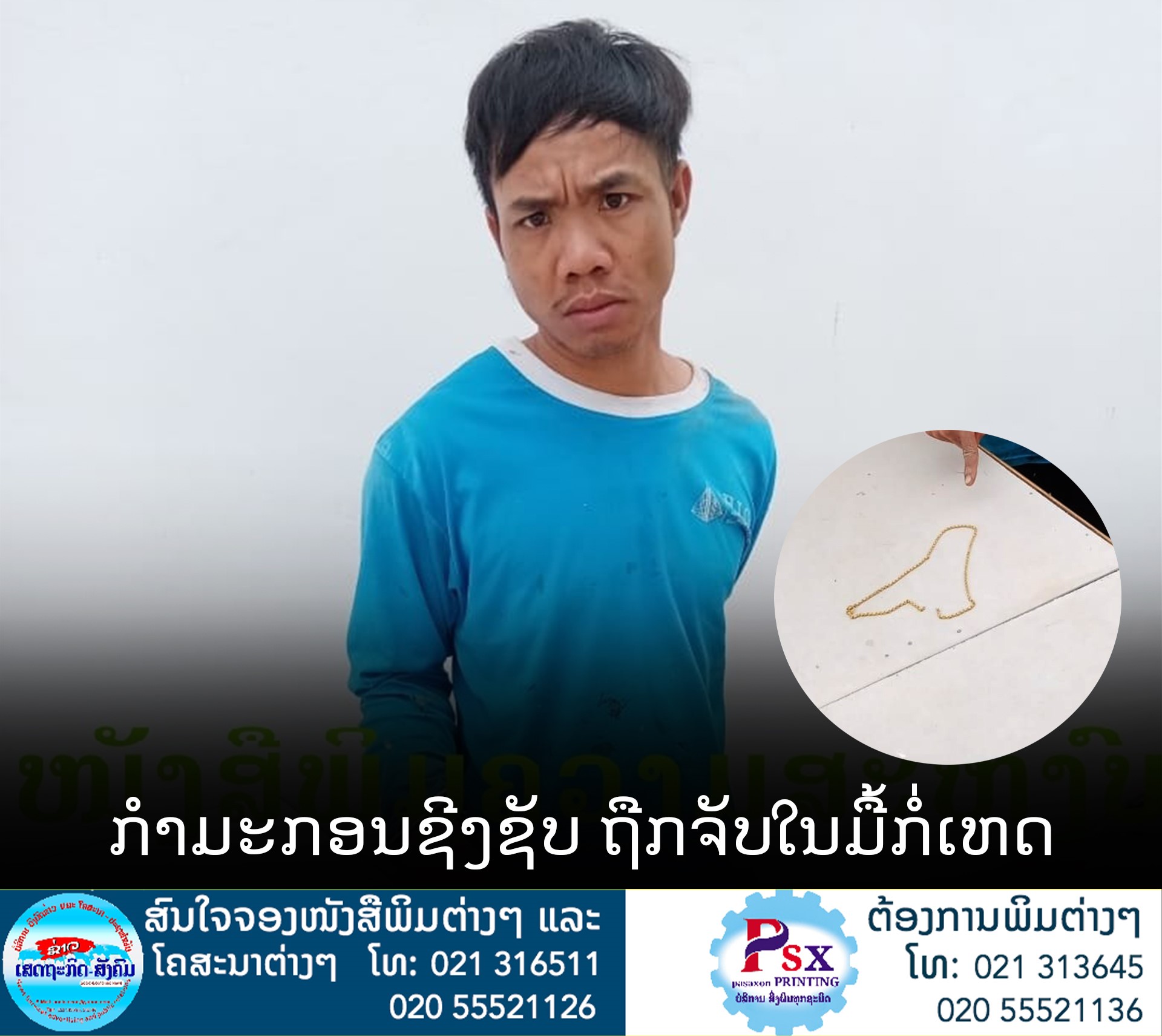 ຊາຍໜຸ່ມໄວ 25 ປີທີ່ລົງມາຈາກຫຼວງພຣະບາງ ແລະ ຮັບຈ້າງເປັນກຳມະກອນຢູ່ບ້ານດົງໂພນແຮ່ ເມືອງຫາດຊາຍຟອງ ນະຄອນຫຼວງວຽງຈັນ, ແຕ່ຊາຍຄົນນັ້ນ ກັບປະພຶດຜິດສິນຂໍ້ 2 ຈ້ອງໝາຍຊີງເອົາຊັບຄົນອື່ນ. ຊຶ່ງພາຍຫຼັງກໍ່ເຫດກໍຖືກຕໍາຫຼວດຈັບຕົວໄດ້ພ້ອມຂອງກາງສາຍຄໍຄໍານ້ໍາໜັກ 1 ບາດ; ຍາດຊີງຂອງຄົນອື່ນມາເປັນຂອງຕົນ, ກໍຕ້ອງທົນທຸກດັ່ງນັ້ນແລ້ວ!.