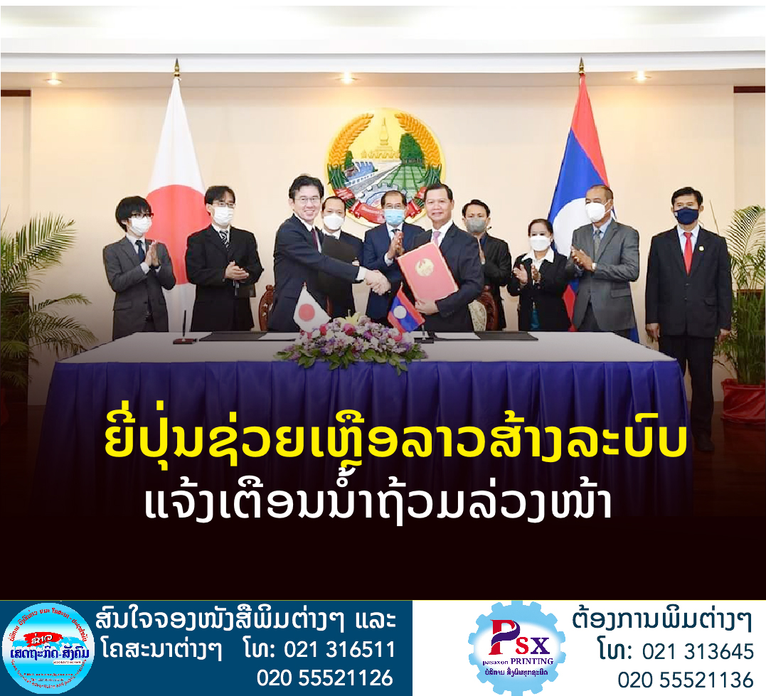 ລັດຖະບານຍີ່ປຸ່ນ ໃຫ້ການຊ່ວຍເຫຼືອລັດຖະບານ ສປປ ລາວ ໃນການສ້າງລະບົບແຈ້ງເຕືອນໄພນໍ້າຖ້ວມລ່ວງໜ້າ ໃນ ແຂວງເປົ້າໝາຍ (ຈໍາປາສັກສາລະວັນສະຫວັນນະເຂດເຊກອງອັດຕະປື ແລະຄໍາມ່ວນ) ລວມມູນຄ່າ ຕື້ເຢນ ຫຼື ປະມານ 8,78 ລ້ານໂດລາສະຫະລັດ.