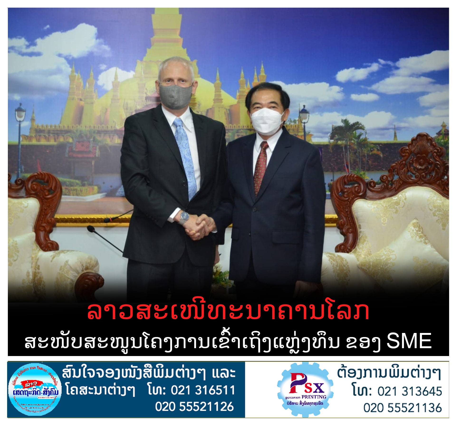 ທ່ານ ຄຳແພງ ໄຊສົມແພງ ລັດຖະມົນຕີກະຊວງອຸດສາຫະກຳ ແລະ ການຄ້າ (ອຄ), ໄດ້ສະເໜີໃຫ້ທະນາຄານໂລກ ສືບຕໍ່ສະໜັບສະໜູນວຽກງານພັດທະນາເສດຖະກິດຂອງ ສປປ ລາວ ໃນໄລຍະການລະບາດ ແລະ ໄລຍະສິ້ນສຸດການລະບາດ. ໂດຍຮຽກຮ້ອງການໜັບສະໜູນໂຄງການເຂົ້າເຖິງແຫຼ່ງທຶນຂອງຈຸນລະວິສາຫະກິດ, ວິສາຫະກິດຂະໜາດນ້ອຍ ແລະ ກາງ (SME) ເພື່ອຮັບມືຜົນກະທົບ ແລະ ຟື້ນຟູຈາກໂຄວິດ-19 (MSME A2F-ESR) ຈຳນວນ 40 ລ້ານໂດລາສະຫະລັດ, ເພື່ອເຮັດແນວໃດໃຫ້ສາມາດໂອນເງິນເຂົ້າມາໄດ້ໄວ.