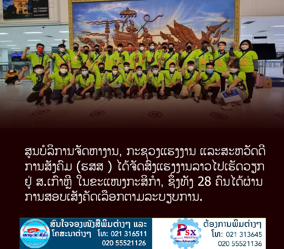 ແຮງງານທັງ 28 ຄົນ ແມ່ນໄດ້ຜ່ານລະບບອະນຸຍາດການຈ້າງງານຕາມລະບົບ MOU .ພ້ອມນີ້ສູນບໍລິການຈັດຫາງງານກໍໄດ້ອົມຮົມເຂົາເຈົ້າໃຫ້ຮູ້ຈັກກ່ຽວກັບຂັ້ນຕອນຕ່າງໆຕັ້ງແຕ່ການຶ້ນຍົນສະໜາມບິນວັດໄຕ ສປປ ລາ ແລະຂັ້ນຕອນຕ່າງໆເມື່ອເດີນທາງເຖິງ ສ.ເກົາຫຼີ,