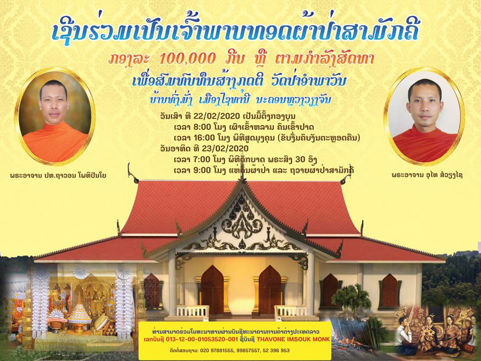 ວັດປ່າອຳພາວັນ ບ້ານທົ່ງມັ່ງ ເມືອງໄຊທານີ ນະຄອນຫຼວງວຽງຈັນ ຈະຈັດງານບຸນທອດຜ້າປ່າສາມັກຄີໃນລະຫວ່າງວັນທີ 22-23 ກຸມພາ 2020 ເພື່ອສົມທົບທຶນສ້າງກຸຕິວັດດັ່ງກ່າວ.