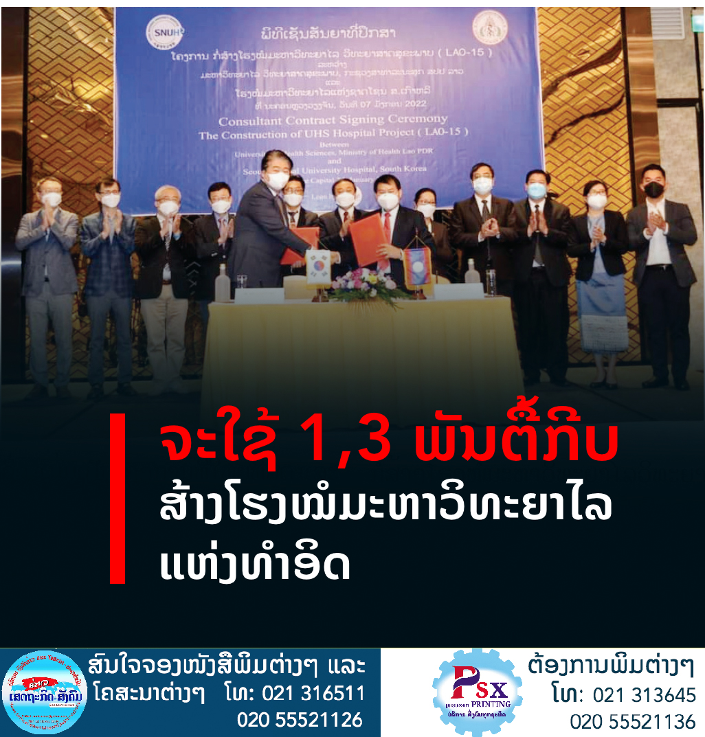 ສປປ ລາວ ຈະນຳໃຊ້ທຶນຈຳນວນ 120 ລ້ານໂດລາ ຫຼືປະມານ 1,3 ພັນຕື້ກີບ ທີ່ເປັນທຶນການຊ່ວຍເຫຼືອໃນຮູບແບບການກູ້ຢືມດອກເບ້ຍຜ່ອນຜັນຈາກ ສ. ເກົາຫຼີ ເພື່ອດຳເນີນໂຄງການກໍ່ສ້າງໂຮງໝໍມະຫາວິທະຍາໄລແຫ່ງທໍາອິດຂອງ ສປປ ລາວ