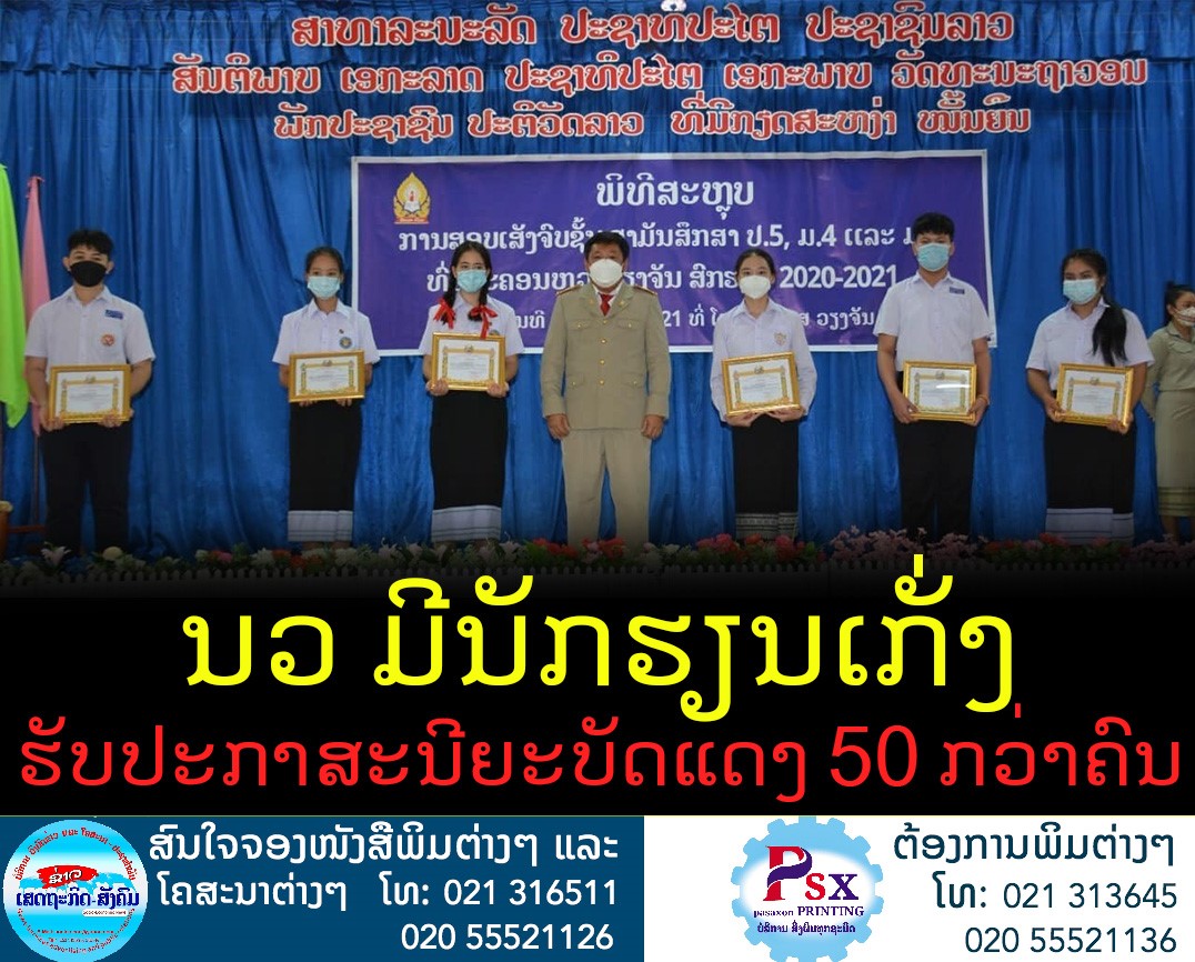 ໃນວັນທີ 30 ທັນວາ 2021 ຜ່ານມາ ທີ່ໂຮງຮຽນມັດ ທະຍົມສຶກສາສົມບູນວຽງຈັນ (ມສ ວຽງຈັນ) ພະແນກສຶກສາທິການ ແລະກີລານະຄອນຫຼວງວຽງຈັນ (ນວ) ໄດ້ຈັດພິທີສະຫຼຸບການສອບ ເສັງຈົບຊັ້ນ ປ5 ມ4 ແລະ ມ7 ປະຈຳສົກຮຽນ 2020-2021 ແບບເຊິ່ງໜ້າ ແລະ ຜ່ານທາງອອນລາຍຂຶ້ນ