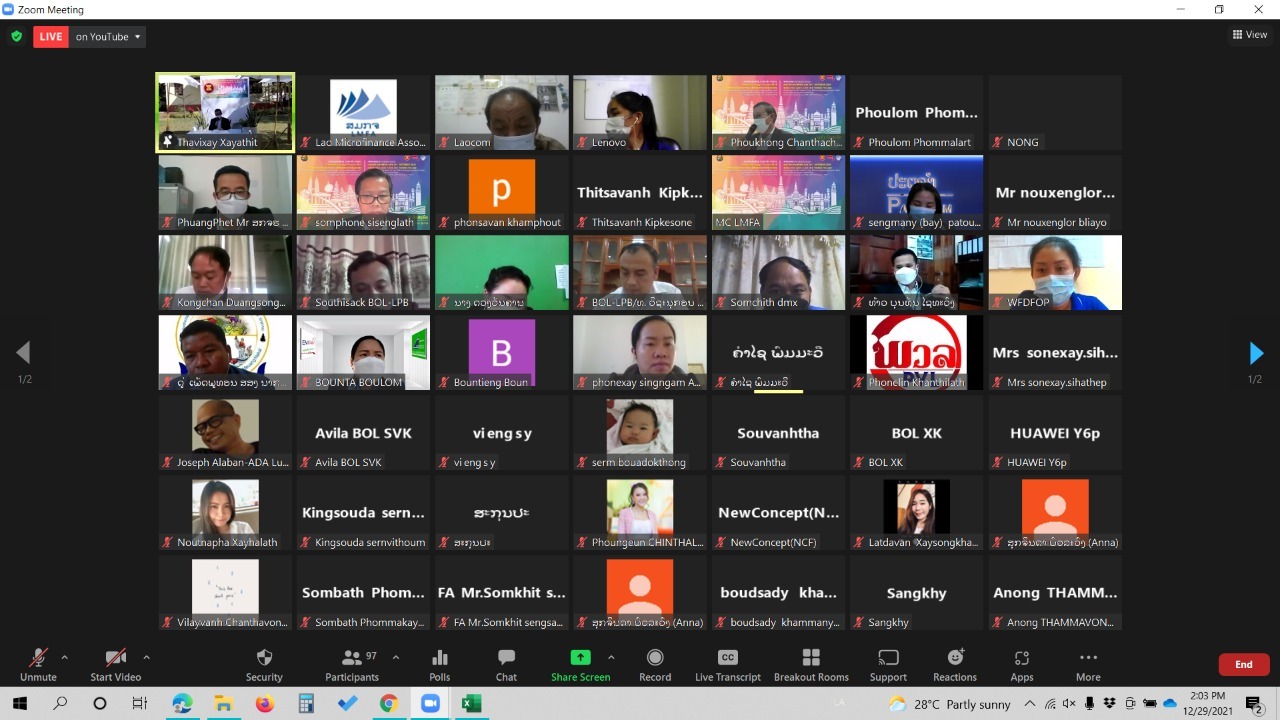 ກົມຄຸ້ມຄອງສະຖາບັນການເງິນທະນາຄານແຫ່ງ ສປປ ລາວ ຮ່ວມກັບສະມາຄົມການເງິນຈຸລະພາກ (ສມກຈ) ໄດ້ຈັດຕັ້ງການສະເຫຼີມສະຫຼອງວັນທ້ອນເງິນອາຊຽນ (ວັນທີ 31 ຕຸລາ) ຜ່ານ ລະບົບອອນລາຍ (Zoom) ໃນວັນທີ 29 ທັນວາ 2021 ທີ່ຫ້ອງການ ສມກຈ, ນະຄອນຫຼວງວຽງຈັນ