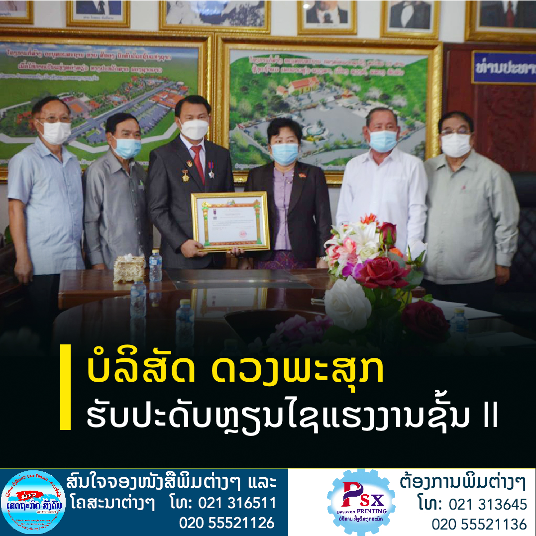 ພິທີປະດັບຫຼຽນໄຊແຮງງານຊັ້ນ II ແລະຫຼຽນກາພັດທະນາໃຫ້ທ່ານ ຄໍາຫຼ້າ ດວງພະສຸກ ປະທານບໍລິສັດດວງພະສຸກກໍ່ສ້າງສ້ອມແປງຂົວ-ທາງ ເຄຫະສະຖານ ແລະຊົນລະປະທານ ຈໍາກັດ ຜູ້ດຽວ ປະທານກໍາມະບານຮາກຖານຄະນະບໍລິຫານງານກໍາມະບານນະຄອນຫຼວງວຽງຈັນ