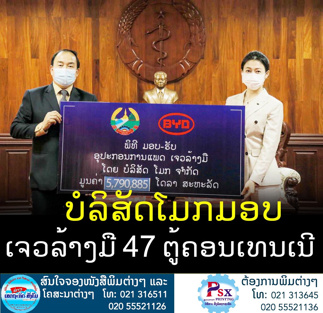ທ້າຍອາທິດຜ່ານມາທາງບໍລິສັດ ໂມກ ໃນນາມຕົວແທນຈໍາໜ່າຍຂອງບໍລິ ສັດ MOK CO,LTD-BYD, ກໍ່ໄດ້ ລະດົມທຶນຮອນມອບເຈວລ້າງມື 47 ຕູ້ ຄອນເທນເນີມູນຄ່າ 5,7 ລ້ານໂດລາສະຫະລັດ