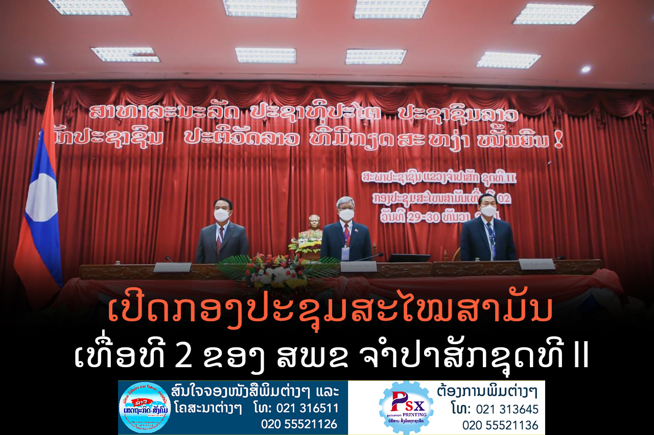 ກອງປະຊຸມສະໄໝສາມັນເທື່ອທີ 2 ຂອງສະພາປະຊາຊົນແຂວງຈໍາປາສັກ ຊຸດທີ II ໄດ້ໄຂຂຶ້ນຢ່າງເປັນທາງການໃນ ຕອນເຊົ້າຂອງວັນທີ 29 ທັນວາ 2021 ທີ່ສະໂມສອນຫຼັກ 4 ຂອງແຂວງພາຍ ໃຕ້ການເປັນປະທານຂອງທ່ານ ສາຍທອງ ໄຊຍະວົງ ປະທານສະພາແຂວງ ຈໍາປາສັກ, ໃຫ້ກຽດເຂົ້າຮ່ວມຂອງທ່ານ ປອ. ວິໄລວົງ ບຸດດາຄໍາ ເຈົ້າແຂວງໆຈໍາປາສັກ, ທ່ານ ສົມມາດ ພົນເສນາ ຮອງປະທານສະພາແຫ່ງຊາດ ສະມາຊິກສາພາແຫ່ງຊາດ ປະຈໍາເຂດ ເລືອກຕັ້ງແຂວງຈໍາປາສັກ, ມີທ່ານສະ ມາຊິກສາພາແຫ່ງຊາດ ແລະສະມາຊິກ ສະພາແຂວງເຂົ້າຮ່ວມ.