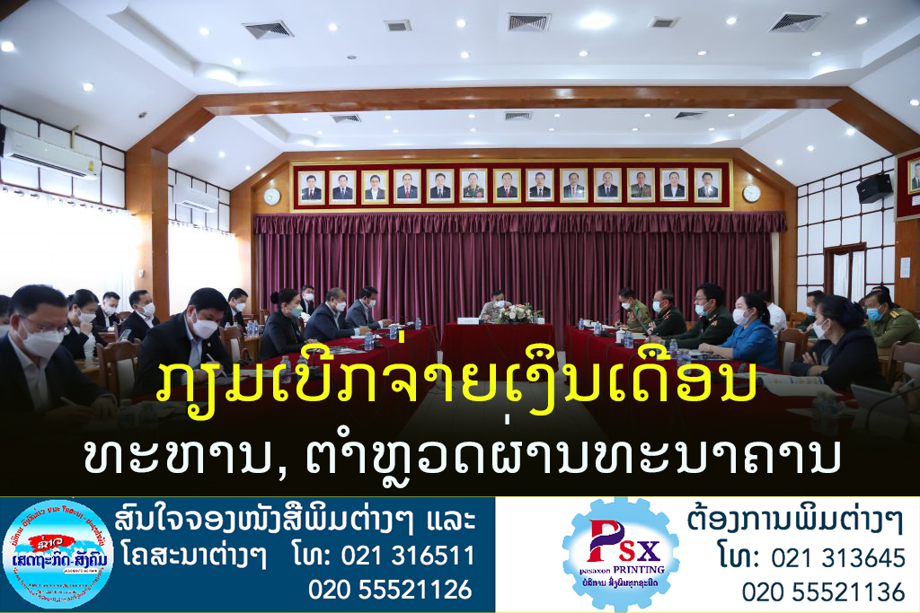 ວັນທີ 23 ທັນວາ 2021 ທີ່ກະຊວງການເງິນ, ໄດ້ຈັດກອງປະຊຸມປຶກສາ ຫາລືຄົ້ນຄວ້າກ່ຽວກັບການເບີກຈ່າຍ ເງິນເດືອນ, ເງິນອຸດໜູນ ແລະ ເງິນນະໂຍ ບາຍຕ່າງໆໃຫ້ແກ່ພະນັກງານທະຫານ, ຕຳຫຼວດຜ່ານລະບົບ ATM