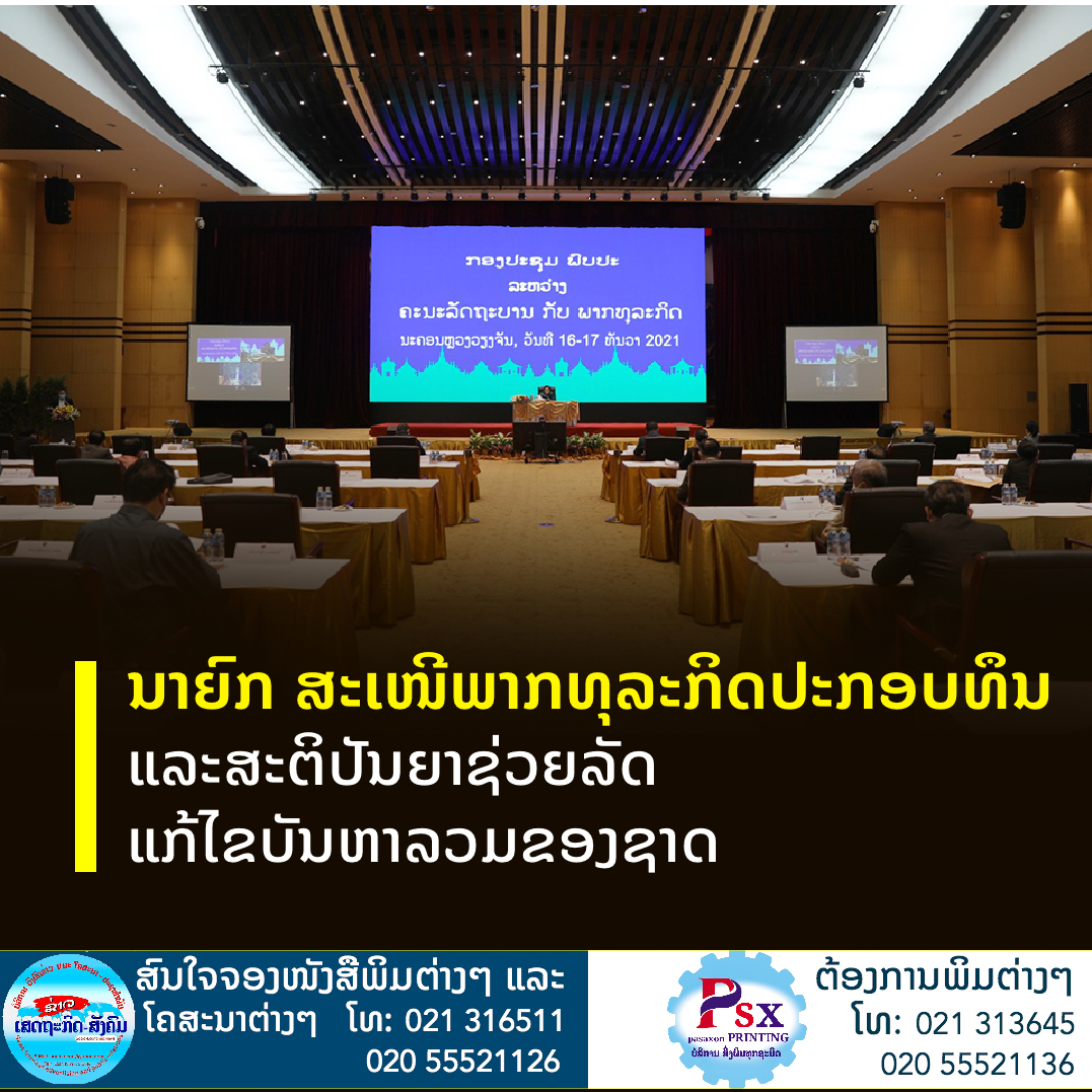 ສໍາລັບນັກທຸລະກິດ ແລະຜູ້ປະກອບການນາຍົກສະເໜີໃຫ້ສືບຕໍ່ຮັກສາມູນເຊື້ອອັນດີງາມຂອງຕົນໃນການປະກອບສ່ວນຢ່າງຕັ້ງໜ້າທາງດ້ານທຶນຮອນ ແລະສະຕິປັນຍາເພື່ອຊ່ວຍລັດຖະບານໃນການແກ້ໄຂບັນຫາລວມຂອງຊາດ.