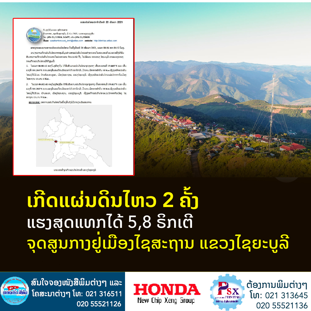 ກົມອຸຕຸນິຍົມ ແລະອຸທົກກະສາດລາຍງານສະພາບການເກີດແຜ່ນດິນໄຫວໃນຄັ້ງວັນທີ 20 ທັນວາ 2021 ເວລາ 04:06 ຫາ 04:12 ໂມງ.