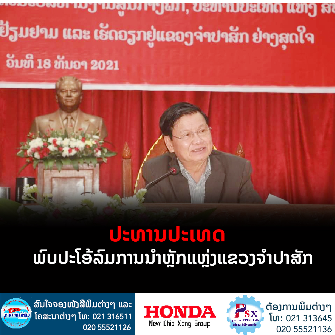 ວັນທີ 18 ທັນວາ 2021, ທ່ານ ທອງລຸນ ສີສຸລິດ ປະທານປະເທດ ແຫ່ງ ສປປ ລາວ ໄດ້ເຄື່ອນໄຫວຢ້ຽມຢາມ ແລະພົບປະໂອ້ລົມພະນັກງານຫຼັກແຫຼ່ງແຂວງຈໍາປາສັກ ທີ່ສະໂມສອນຂອງແຂວງໂດຍເປັນກຽດຕ້ອນຮັບຂອງທ່ານ ວິໄລວົງ ບຸດດາຄໍາ ເຈົ້າແຂວງຈໍາປາສັກ,