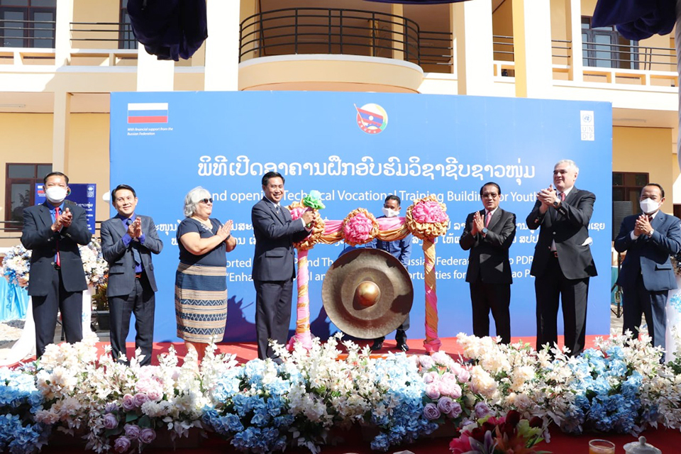 ພິທີເປີດການນຳໃຊ້ອາຄານຝຶກອົບຮົມວິຊາຊີບຊາວໜຸ່ມຢູ່ສູນຝຶກອົບຮົມວິຊາຊີບແຂວງຄຳມ່ວນພາຍໃຕ້ “ໂຄງການເສີມສ້າງໂອກາດທາງດ້ານສັງຄົມ ແລະເສດຖະກິດ ໃຫ້ກັບຊາວໜຸ່ມໃນ ສປປ ລາວ” ໂດຍການສະໜັບສະໜູນຈາກອົງການສະຫະປະຊາຊາດເພື່ອການພັດທະນາ ປະຈຳ ສປປ ລາວ