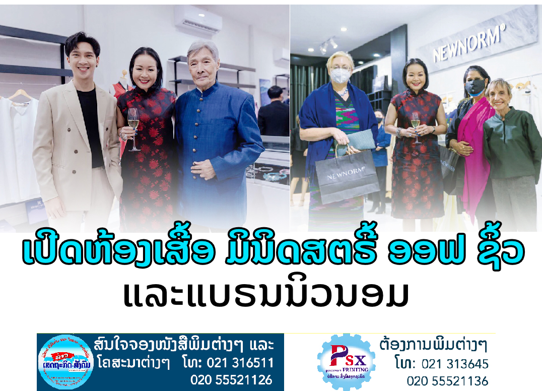 ທ້າຍອາທິດຜ່ານມາໄດ້ມີງານເປີດຕົວຫ້ອງເສື້ອແຫ່ງໃໝ່ຂອງແບຣນດັງຂອງລາວມິນິດສຕຣີ້ ອອຟ ຊິ້ວ (Ministry of Silk) ແລະ ແບຣນນ້ອງໃໝ່ທີ່ຢູ່ໃນເຄືອດຽວກັນຊື່ວ່າ ນິວນອມ (NEWNORM) ໂດຍມີແຂກສຳຄັນຕ່າງໆບໍ່ວ່າຈະເປັນບັນດາເອກອັກຄະລັດຖະທູດ ແລະທູຕານຸທູດຕ່າງໆ,
