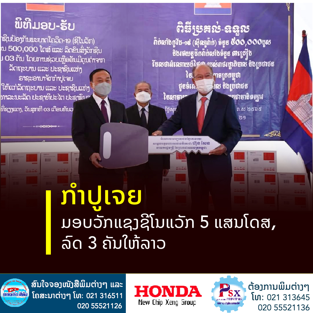 ລັດຖະບານ ແລະປະຊາຊົນແຫ່ງ ຣາຊະອານາຈັກກໍາປູເຈຍໄດ້ມອບວັກຊິນຊີໂນແວັກ (Sinovac) ຈໍານວນ 5 ແສນໂດສ ແລະລົດຂົນສົ່ງວັກຊິນຈຳນວນ 3 ຄັນ ໃຫ້ແກ່ລັດຖະບານ ແລະປະຊາຊົນລາວ ເພື່ອນໍາໃຊ້ເຂົ້າໃນການຕ້ານ ແລະສະກັດກັ້ນ ການແຜ່ລະບາດຂອງພະຍາດໂຄວິດ-19 ຢູ່ ສປປ ລາວ.