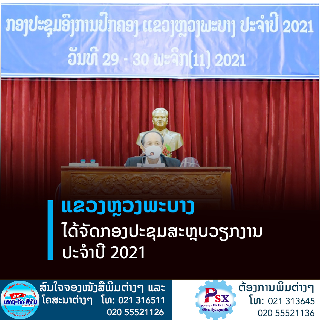 ໃນລະຫວ່າງວັນທີ 29-30 ພະຈິກ 2021 ນີ້ ອົງການປົກຄອງແຂວງຫຼວງພະບາງໄດ້ຈັດກອງປະຊຸມສະຫຼຸບວຽກງານປະຈໍາປີ 2021 ຂຶ້ນເພື່ອຕີລາຄາການຈັດຕັ້ງປະຕິບັດວຽກງານໃນໄລຍະຜ່ານມາໂດຍການເປັນປະທານຂອງ ທ່ານ ຄໍາຂັນ ຈັນທະວີສຸກ ເຈົ້າແຂວງໆ ຫຼວງພະບາງ,