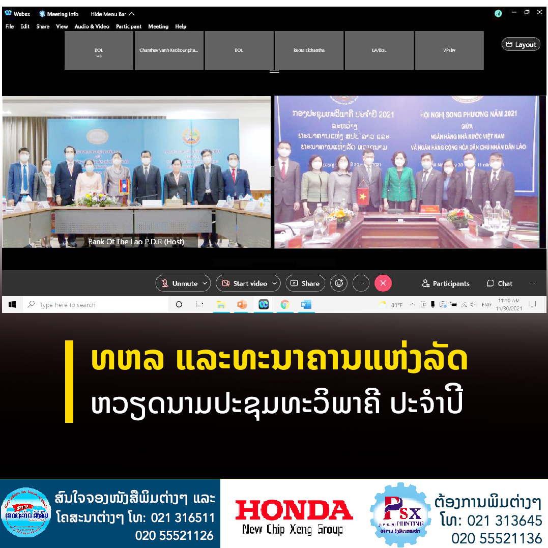 ວັນທີ 30 ພະຈິກ 2021 ທີ່ທະນາຄານແຫ່ງ ສປປ ລາວ ( ທຫລ) ນະຄອນຫຼວງວຽງຈັນ, ທຫລ ໄດ້ຮັບກຽດເປັນເຈົ້າພາບຈັດກອງປະຊຸມທະວິພາຄີປະຈໍາປີ 2021 ລະຫວ່າງທະນາຄານແຫ່ງ ສປປ ລາວ ແລະທະນາຄານແຫ່ງລັດຫວຽດນາມ