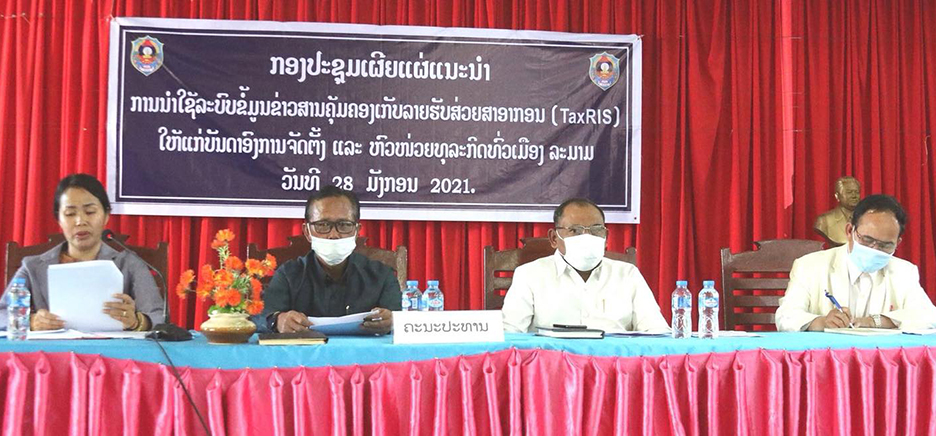 ວັນທີ 28 ມັງກອນ 2021 ກົມສ່ວຍສາອາກອນກະຊວງການເງິນ,ຄັງເງິນແຫ່ງຊາດຮ່ວມກັບສ່ວຍສາອາກອນປະຈໍາແຂວງເຊກອງ ແລະທະນາຄານການຄ້າຕ່າງປະເທດລາວມະຫາຊົນໄດ້ຈັດຕັ້ງເຜີຍແຜ່ແນະນໍາການນໍາໃຊ້ລະບົບຂໍ້ມູນຂ່າວສານຄຸ້ມຄອງເກັບລາຍຮັບສ່ວຍສາອາກອນແທັກຣິສ (TaxRIS)