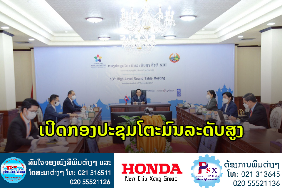 ວັນທີ 17 ພະຈິກ 2021 ທີ່ນະຄອນຫຼວງວຽງຈັນ, ໄດ້ມີກອງປະຊຸມໂຕະມົນລະດັບສູງ ຄັ້ງທີ 13 ໃນ ສປປ ລາວ ທາງອອນລາຍພາຍໃຕ້ຫົວຂໍ້: “ເພີ່ມທະວີການເປັນຄູ່ຮ່ວມເພື່ອຍົກສູງປະສິດທິຜົນໃນການຈັດຕັ້ງປະຕິບັດແຜນພັດທະນາເສດຖະກິດ-ສັງຄົມ