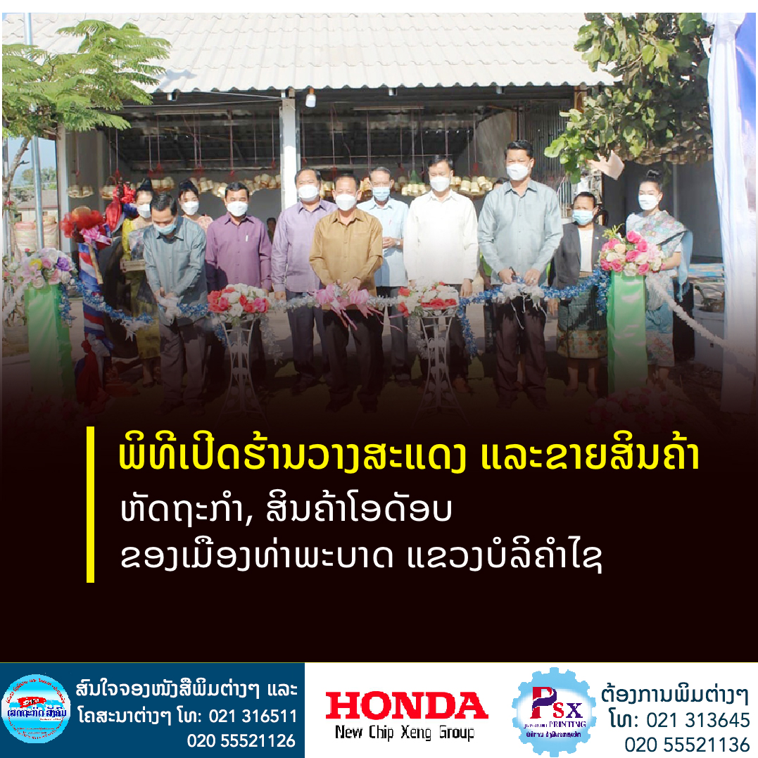 ພິທີເປີດຮ້ານວາງສະແດງ ແລະຂາຍສິນຄ້າຫັດຖະກຳ, ສິນຄ້າໂອດັອບໜຶ່ງເມືອງໜຶ່ງຜະລິດຕະພັນຂອງເມືອງທ່າພະບາດ ແຂວງບໍລິຄຳໄຊ ໄດ້ຈັດຂຶ້ນໃນວັນທີ 15 ພະຈິກ 2021 ທີ່ບ້ານໂພນສັນ ເປັນກຽດເຂົ້າຮ່ວມຂອງທ່ານ ຄຳແຫວນ ປັນຍານຸວົງ ຮອງເຈົ້າແຂວງບໍລິຄຳໄຊ,