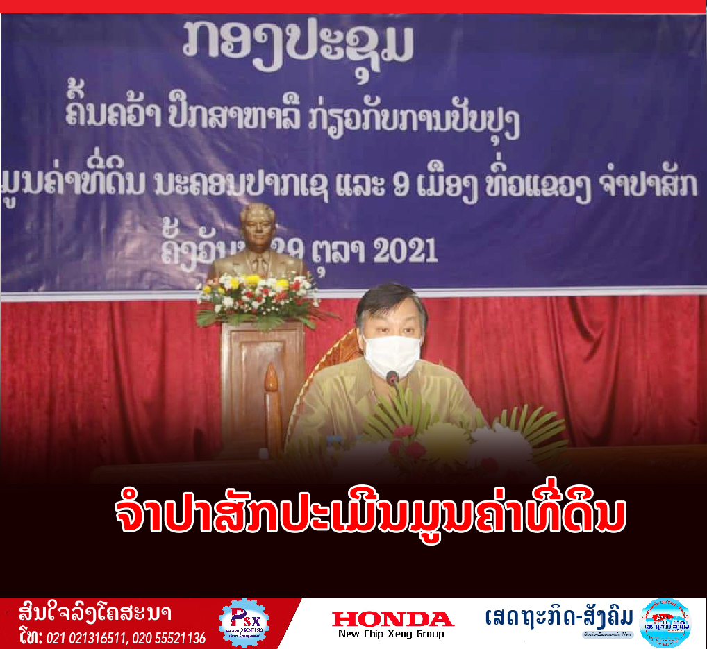 ພະແນກຊັບພະຍາກອນທໍາມະຊາດ ແລະສິ່ງແວດລ້ອມ (ພຊສ) ແຂວງຈໍາປາສັກ ໄດ້ຈັດກອງປະຊຸມຄົ້ນຄວ້າປຶກສາຫາລືກ່ຽວກັບການປັບປຸງເຂດປະເມີນມູນຄ່າທີ່ດິນໃນນະຄອນປາກເຊ ແລະ 9 ເມືອງທົ່ວແຂວງຂຶ້ນໃນວັນທີ 29 ຕຸລານີ້ ທີ່ສະໂມສອນແຂວງຫຼັກ 4 ນະຄອນປາກເຊ