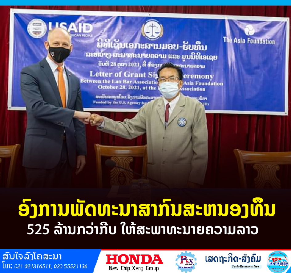 ວັນທີ 28 ຕຸລານີ້ ທີ່ສໍານັກງານສານປະຊາຊົນນະຄອນຫຼວງວຽງຈັນ, ອົງການພັດທະນາສາກົນປະເທດສະຫະລັດອາເມລິກາ ຫຼື USAID ໄດ້ສະໜັບສະໜູນທຶນມູນຄ່າ 525,16 ລ້ານກີບ ໃຫ້ແກ່ສະພາທະນາຍຄວາມລາວ.