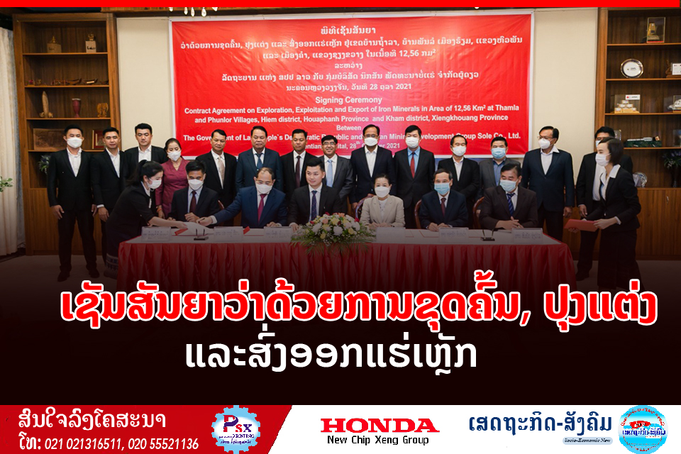 ເວລາ 17:00 ໂມງ ຂອງວັນທີ 28 ຕຸລາ 2021, ທີ່ກະຊວງແຜນການ ແລະການລົງທືນໄດ້ຈັດພິທີເຊັນສັນຍາວ່າດ້ວຍການຂຸດຄົ້ນ, ປຸງແຕ່ງ ແລະສົ່ງອອກແຮ່ເຫຼັກ ຢູ່ເຂດບ້ານຖໍ້າລາ, ບ້ານພັນລໍ ເມືອງຮ້ຽມ, ແຂວງຫົວພັນ ແລະເມືອງຄຳ, ແຂວງຊຽງຂວາງ ໃນເນື້ອທີ 12,56 ກິໂລຕາແມັດ,