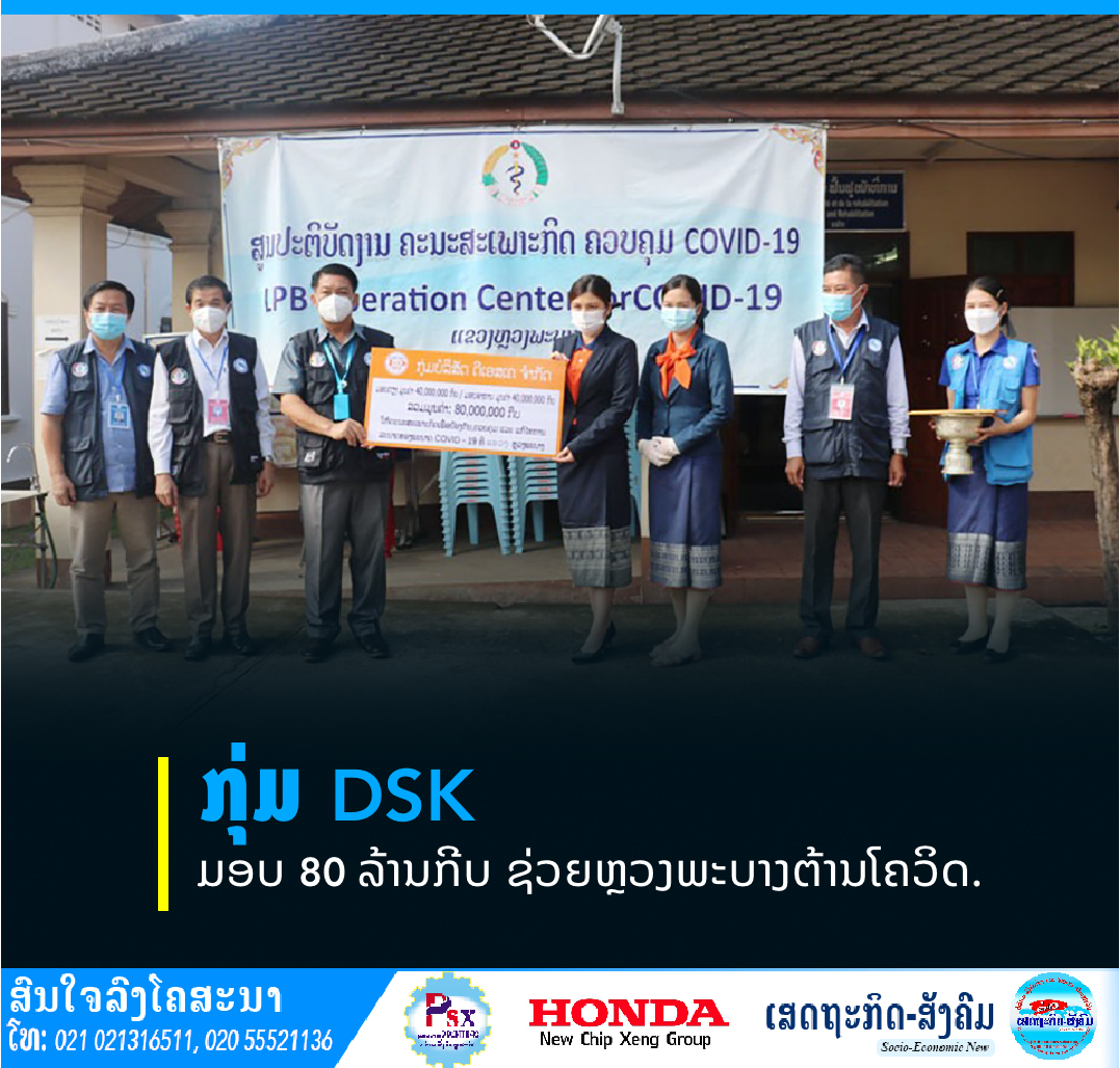 ທ່ານ ນາງ ດາວລຸນນີ ຊະນະແກ້ວ ຕາງໜ້າກຸ່ມບໍລິສັດ ດີເອສເຄ (DSK) ໄດ້ນໍາເອົາວັດຖຸປັດໄຈປະກອບມີຕຽງ 200 ໜ່ວຍ ແລະເຄື່ອງບໍລິໂພກຈໍານວນໜຶ່ງມາມອບໃຫ້ຄະນະສະເພາະກິດຂັ້ນແຂວງຫຼວງພະບາງໃນວັນທີ 21 ຕຸລາ 2021