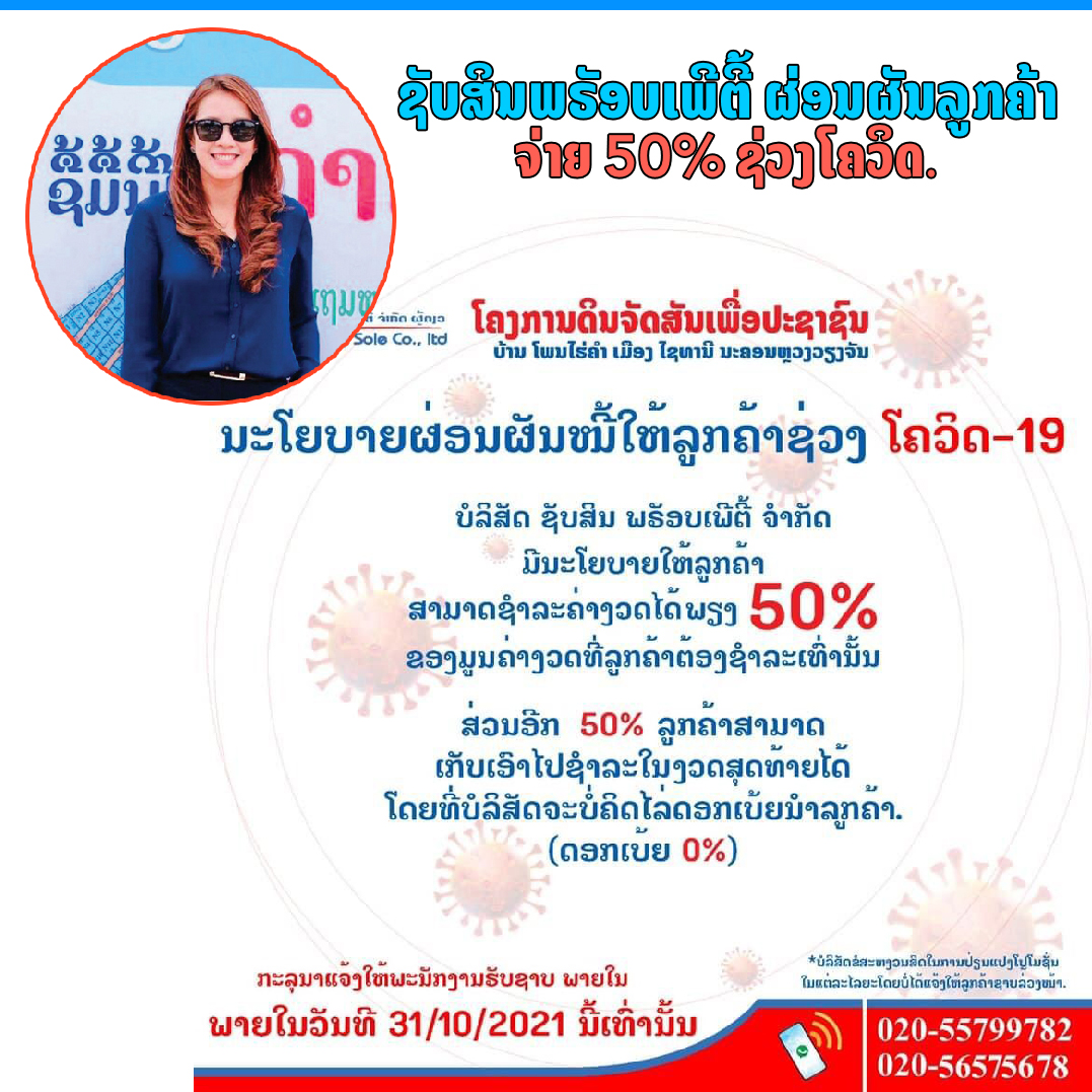 ຂ່າວດີສຳລັບຜູ້ທີ່ໄດ້ຮັບຜົນກະທົບຈາກໂຄວິດ-19 ທີ່ບໍ່ສາມາດຊໍາລະຄ່າງວດດິນໄດ້ຕາມປົກກະຕິບໍລິສັດ ຊັບສິນພຣັອບເພີຕີ້ ຈຳກັດ ມີນະໂຍບາຍໃຫ້ແກ່ລູກຄ້າຜູ້ທີ່ບໍ່ສາມາດຊໍາລະຄ່າງວດໄດ້ຕາມປົກກະຕິຄືລູກຄ້າສາມາດຊໍາລະຄ່າງວດໄດ້ພຽງ 50% ຂອງມູນຄ່າງວດທີ່ລູກຄ້າ ຕ້ອງຊໍາລະທົ່ານັ້ນ.