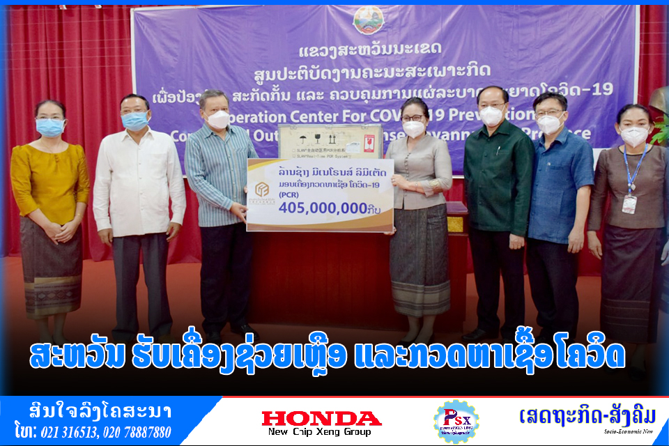 ທີ່ຫ້ອງວ່າການປົກຄອງແຂວງສະຫວັນນະເຂດ ໃນວັນທີ 28 ກັນຍາ 2021, ໄດ້ຈັດພິທີມອບ-ຮັບເຄື່ອງຊ່ວຍເຫຼືອຈາກອົງການພັດທະນາສາກົນປະເທດສະຫະລັດອາເມລິກາ ແລະເຄື່ອງກວດຫາເຊື້ອພະຍາດໂຄວິດ-19(PCR) ຈາກບໍລິສັດລ້ານຊ້າງມິເນໂຣນສ໌ລິມິເຕັດ