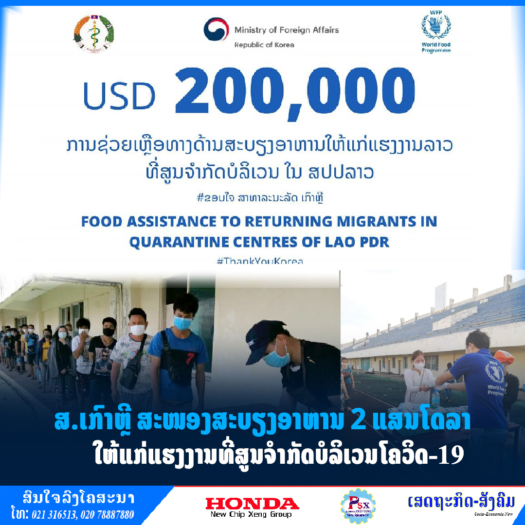 ສ.ເກົາຫຼີ ສະໜອງສະບຽງອາຫານ 2 ແສນໂດລາ ໃຫ້ແກ່ແຮງງານທີ່ສູນຈໍາກັດບໍລິເວນໂຄວິດ-19