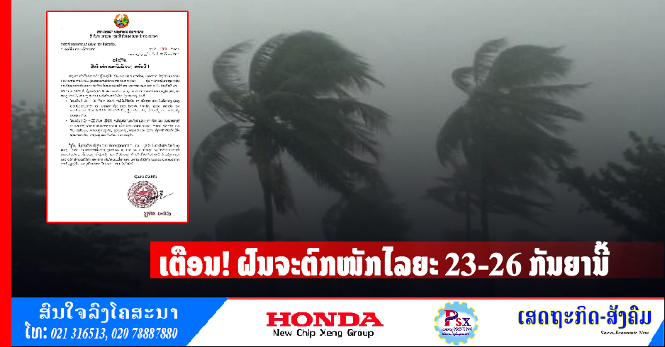ກົມອຸຕຸນິຍົມ ແລະອຸທົກກະສາດ ອອກແຈ້ງເຕືອນຝົນຕົກໜັກ ແລະລົມພັດແຮງ ສະບັບທີ 1 ເນື່ອງຈາກຮ່ອງຄວາມກົດດັນອາກາດຕໍ່າ ຫຼືຮ່ອງຝົນໄດ້ພາດຜ່ານເຂດພາກໃຕ້ຂອງປະເທດລາວປ່ອງໃສຍ່ອມຄວາມກົດດັນອາກາດຕໍ່າທີ່ປົກຄຸມຢູ່ເຂດທະເລຈີນ