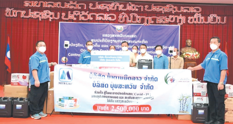 ໃນວັນທີ 25 ສິງຫາ 2021 ບໍລິສັດ ນໍ້າຕານມິດລາວ ຈຳກັດ ແລະ ບໍລິສັດ ປຸ໋ຍສະຫວັນ ຈຳກັດ ໄດ້ມອບອຸປະກອນການແພດ ແລະໄດ້ສະໜັບສະໜູນເພີ່ມເຕີມມອບອາຫານທ່ຽງໃຫ້ແກ່ຄະນະສະເພາະກິດປ້ອງກັນ, ສະກັດກັ້ນ ແລະຄວບຄຸມການແຜ່ລະບາດພະຍາດໂຄວິດ-19,