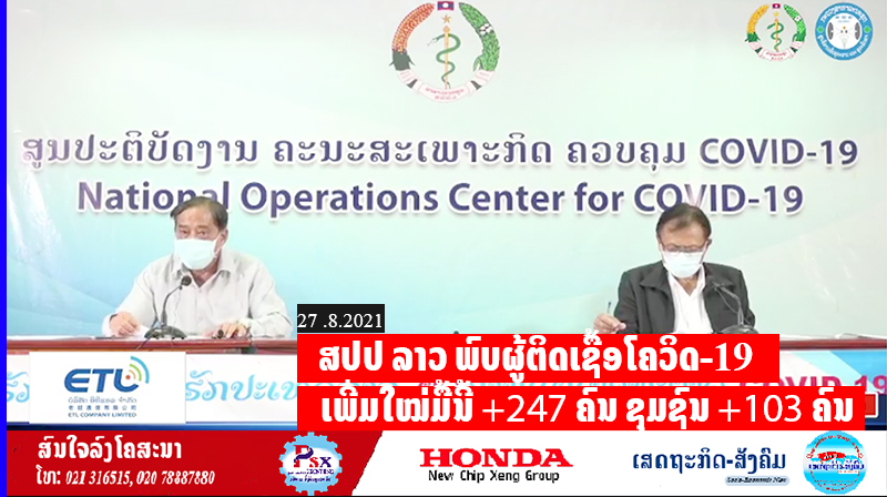 ອີງຕາມການລາຍງານ ຂອງຄະນະສະເພາະກິດ ປະຈຳວັນທີ 27 ສິງຫາ 2021 ໃຫ້ຮູ້ວ່າ : ສປປ ລາວ ໄດ້ກວດວິເຄາະທັງໝົດ 3740 ຕົວຢ່າງ, ນະຄອນຫຼວງ 1469 ຕົວຢ່າງ, ສະຫວັນນະເຂດ 650, ຈໍາປາສັກ 275: ກວດພົບເຊື້ອ 247 ຕົວຢ່າງ, ຕິດເຊື້ອໃນຊຸມຊົນເຖິງ 103 ຄົນ