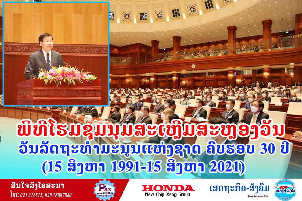ໃນວັນທີ 13 ສິງຫາຜ່ານມາທີ່ຫໍສະພາແຫ່ງຊາດໄດ້ມີພິທີໂຮມຊຸມນຸມສະເຫຼີມສະຫຼອງວັນລັດຖະທຳມະນູນແຫ່ງຊາດ ຄົບຮອບ 30 ປີ (15 ສິງຫາ 1991-15 ສິງຫາ 2021) ໂດຍໃຫ້ກຽດເຂົ້າຮ່ວມໃນພິທີຂອງທ່ານ ທອງລຸນ ສີສຸລິດ ປະທານປະເທດ ແຫ່ງ ສປປ ລາວ;