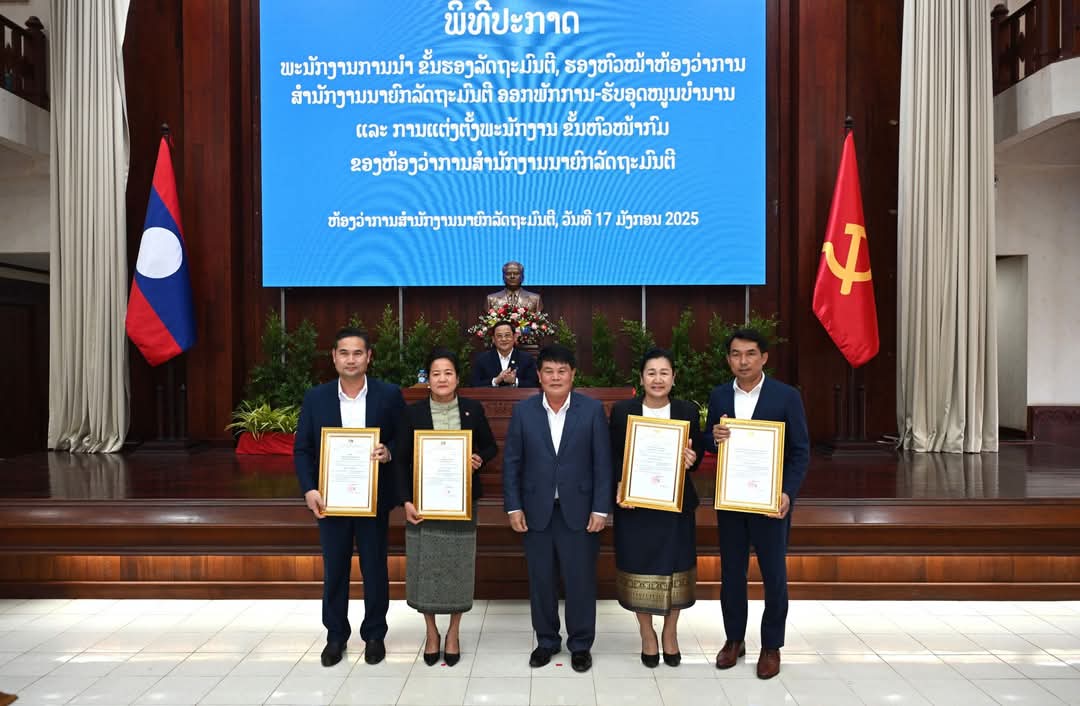 ໃນຕອນບ່າຍວັນທີ 17 ມັງກອນ 2025 ຫ້ອງວ່າການສໍານັກງານນາຍົກລັດຖະມົນຕີ (ຫສນຍ) ໄດ້ຈັດພິທີປະກາດການຈັດຕັ້ງ ໂດຍການໃຫ້ກຽດເຂົ້າຮ່ວມເປັນປະທານ ແລະ ໂອ້ລົມໃຫ້ທິດຊີ້ນຳ ຂອງທ່ານ ສອນໄຊ ສີພັນດອນ, ນາຍົກລັດຖະມົນຕີ;