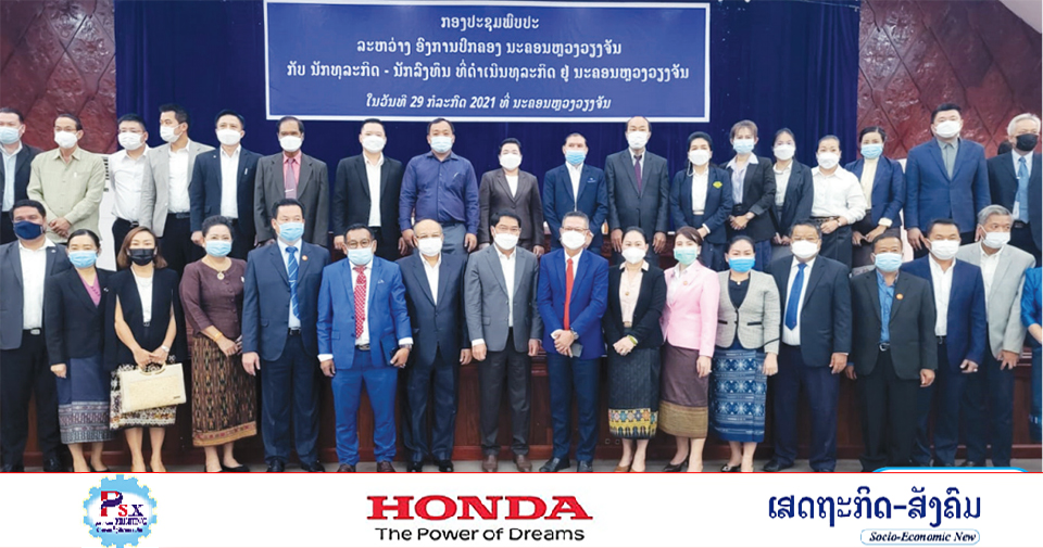 ກອງປະຊຸມພົບປະລະຫວ່າງອົງການປົກຄອງນະຄອນຫຼວງວຽງຈັນກັບນັກທຸລະກິດ-ນັກລົງທຶນທີ່ດໍາເນີນທຸລະກິດຢູ່ນະຄອນຫຼວງວຽງຈັນຈັດຂຶ້ນວັນທີ 29 ກໍລະກົດ 2021 ທີ່ຫ້ອງວ່າການນະຄອນຫຼວງວຽງຈັນ